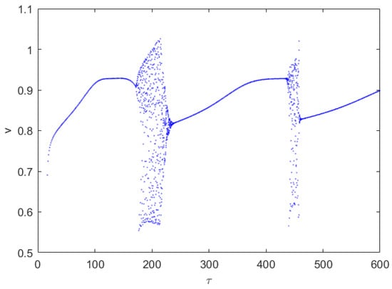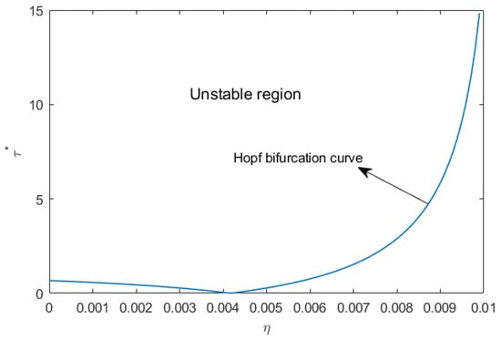 Now, stipulate the parameters as and in this case that system (1) possesses a unique positive equilibrium . Solving Equation (23), we obtain two positive solutions and . Moreover, the critical values of can be obtained, from (25), as