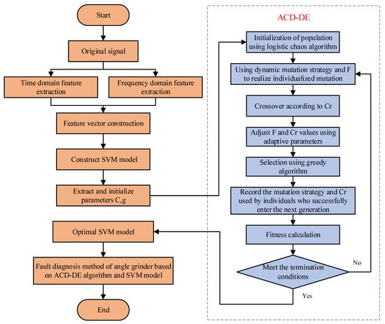 Flow chart of fault diagnosis method of angle grinder based on ACD-DE algorithm and SVM model.
