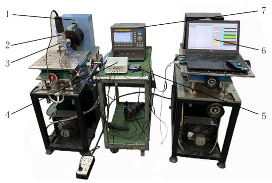 The data acquisition test bench. (1) Eddy current dynamometer; (2) angle grinder; (3) triaxial acceleration sensor; (4) constant current excitation power supply; (5) USB-6001; (6) upper computer; (7) TP700 data recorder.
