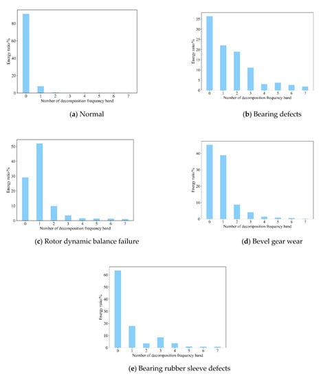 Energy spectrum of vibration signal in x-axis direction. (a) Energy spectrum in normal state; (b) energy spectrum under bearing defects; (c) energy spectrum under rotor dynamic balance failure; (d) energy spectrum under bevel gear wear; (e) energy spectrum under bearing rubber sleeve defects.