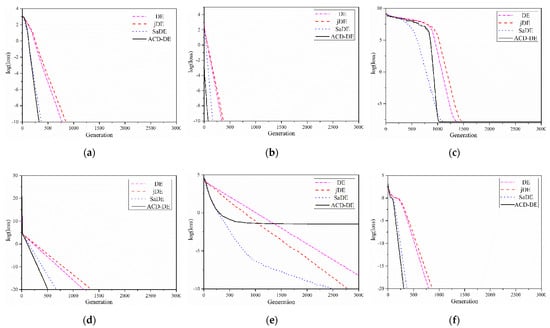 Median convergence characteristics of DE, jDE, SaDE, and ACD-DE on test functions. (a) Convergence curve of F3; (b) convergence curve of F4; (c) convergence curve of F5; (d) convergence curve of F6; (e) convergence curve of F7; (f) convergence curve of F8.
