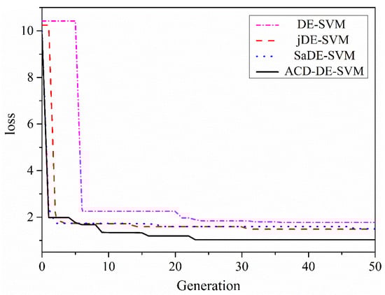 The differential evolution algorithm (DE) is widely used in fault diagnosis and other fields because of its fast optimization speed, less controlled parameters, and strong robustness. Some scholars have applied the DE algorithm to fault diagnosis based on the machine SVM model. Cao Longhan et al. proposed a method of optimizing the SVM based on the DE algorithm and applied it to the fault diagnosis of diesel engine valve and established a diesel engine valve clearance fault diagnosis model based on DE algorithm optimized SVM model []. Tapas Bhadra et al. proposed an SVM parameter optimization algorithm based on DE algorithm. Experiments show that the performance of the DE algorithm to optimize the SVM model is better than that of a single classifier []. The dynamic parameters of SVM model are set by the DE algorithm, which improves the performance of the SVM model. As an optimization algorithm, the search breadth and depth of the DE algorithm have a great impact on the performance of the SVM model. However, with the iteration, the mutation operation in the DE algorithm will rapidly reduce the search breadth and search depth of SVM model, making the algorithm fall into a local optimal solution.