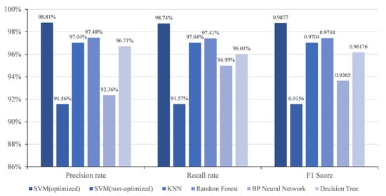 The comparison results are shown in Figure 7, in which the non-optimized SVM model and other machine learning models are trained using the parameters of literatures [,,,,]. Table 7 shows the running time of different models.