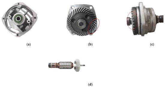 Figure 8 shows the disassembly results of the angle grinder No. 2. The rotor and bearing of the angle grinder have no obvious faults. The surface of the rotor commutator is worn smoothly, the bearing operates flexibly, the stator and rotor iron core and coil are normal, and there is no wear and damage, but some tooth surfaces of the bevel gear have serious wear (the range drawn by the red circle in Figure 8b,c).