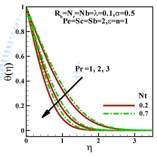 - Thermal boundary layer thickness decreases with the increasing Prandtl number.