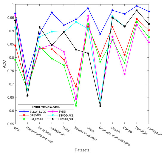 Table 4 shows the F1 values of the BLSW_SVDD model and other SVDD models. The BLSW_SVDD model achieves the highest F1 measurements on 11 datasets, (e.g., Wbc). For the Inosphere dataset, the SSVDD_Ψ2 model achieves the highest F1 values. For the Wbc and Vowels datasets, the SSVDD model only achieves the second highest F1 values for the BLSW_SVDD model. For the BLSW_SVDD model proposed in this study, the F1 values reach more than 90% on 9 datasets, such as Cardio, with the corresponding F1 measurements for the Pendigits dataset reaching 99.77%. For the four sub-models of SSVDD, the SSVDD_Ψ4 model is the best-performing, followed by the SSVDD_Ψ2 model. The comparison plots of the F1 values of the SSVDD_Ψ2 and SSVDD_Ψ4 models with those of the other four SVDD models are shown in Figure 5.