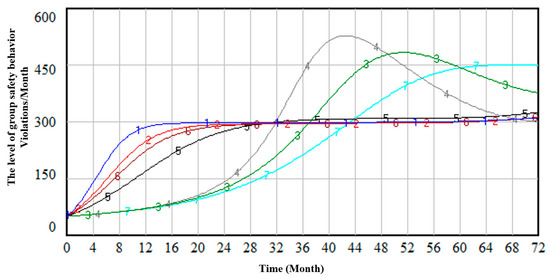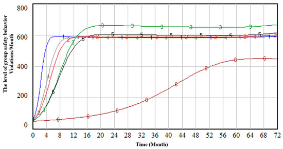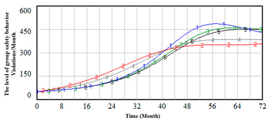 Carry out intervention decision simulation on the SD model of group safety behavior level and increase the intervention intensity of various intervention decisions of the organization and management. Figure 6 shows the simulation diagram of the correction intensity of various intervention decisions in the organization and management.