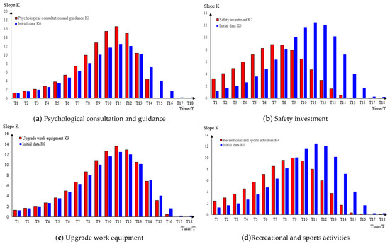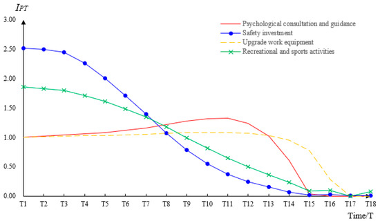 Therefore, the criterion for determining the intensity of intervention decision correction is established: when IPT > 1, it means that the decision has a significant effect on the improvement of group safety behavior level; when IPT < 1, it means that the effect of this decision on correction and improvement of group safety behavior level is poor. The larger the IPT, the better the corrective effect of the decision-making intensity on the safety behavior level of the group during the time period. According to the criterion of correction intensity, taking IPT = 1 as the baseline, cultural, sports and entertainment activities and fund security investment have a more obvious effect on the improvement of group safety behavior level correction within the time period of T1–T8, of which the correction intensity of fund security investment is higher; psychological counseling and counseling and upgrading work equipment have a more obvious effect on improving group safety behavior level correction during the T8–T13 time period and the intensity of psychological counseling and counseling correction is higher.