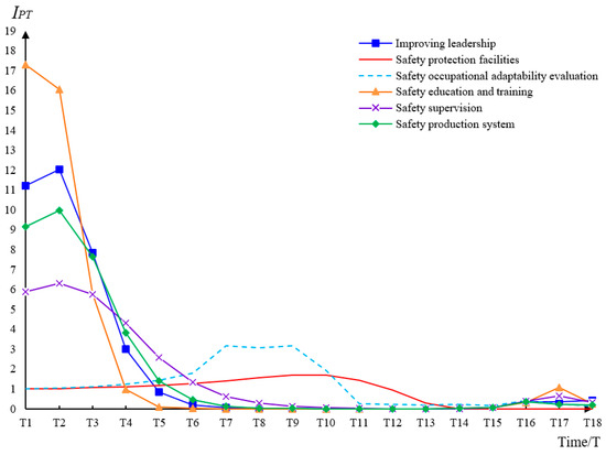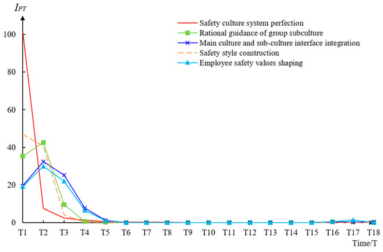 According to the criterion of correction strength, take IPT = 1 as the baseline. The improvement of safety culture system, the construction of safety style, the reasonable guidance of subculture, the integration of main culture and subculture, and the shaping of employee safety values have a more obvious effect on the correction and improvement of group safety behavior level during the T1–T5 period, that is, the improvement of the safety culture system has the strongest correction intensity in the T1 time period and the construction of safety style and the reasonable guidance of group subcultures have the strongest correction intensity in the T2 time period, the integration of the main culture and the subculture and the shaping of employee safety values have the strongest correction intensity during the T3–T5 period.