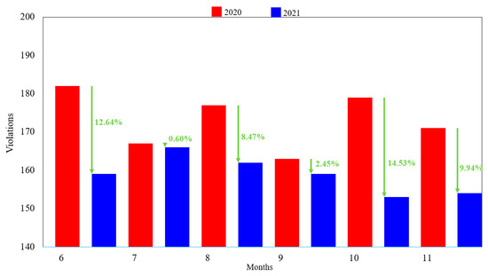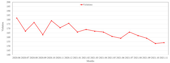 The research results of this paper have been applied to coal mining enterprises, and the safety supervision measures have been adjusted in June 2020. This series of measures has been implemented for one year, and employees’ violations have been summarized and analyzed. In order to observe the application effect of management measures on workers’ safety behavior, the evolution trend of employees’ violation behavior is counted from 2020 to 2021, as shown in Figure 11.