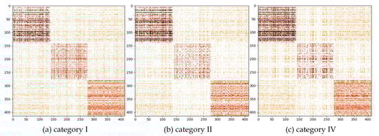 Using the trade import and export data obtained in Section 2.2, this paper constructs weighted super adjacency matrices of the western various agricultural products along the “Belt and Road”, which are M′1, M′2, and M′3. To better understand M′1, M′2, and M′3, we use a heat map [34,35] to visualize them, as shown in Figure 2.