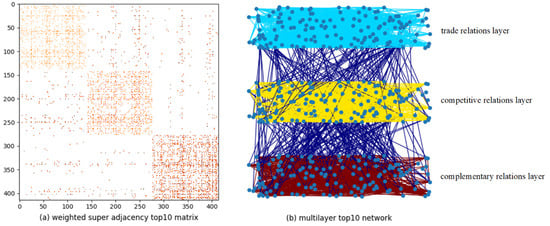 Based on the weighted super adjacency matrices M′1, M′2, and M′3 built in Section 3.2, we use Python to visualize the multilayer network of trade relations of the western various agricultural products. We take category I agricultural products as an example and construct its topology of multilayer network of trade relations. Since the network is very dense, we adopt a method used in the literature [25] and extract the top10 matrices from the matrix of trade relations X, matrix of competitive relations Y, and matrix of complementary relations Z, respectively. We then construct the weighted super adjacency top10 matrices, as shown in Figure 3a. Based on this, we construct the top10 topology of the category I agricultural multilayer network of trade relations, as shown in Figure 3b.