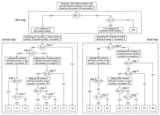 The first step involves identifying the key trading countries and potential trading countries of country i among the “Belt and Road” countries. The analytical process is shown in the dashed box in the first step of Figure 4 and can be described as follows.