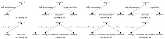 We start by analyzing the matrix of complementary relations Z in the weighted super adjacency matrix M′ to judge if Zkj > Zij holds. If it does, we will conclude that the complementary relation between country j and country k is stronger than that between country j and country i and move on to step 6; if it does not, we will conclude that the complementary relation between country j and country k is not stronger than that between country j and country i. Combining the results of steps 1–2 and 4, we can see that the local network structure between country j and country i is depicted in Figure 5c, and country j is classified as an A7 country.