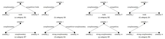 We start by analyzing the matrix of competition–complementary interlayer relations YZ in the weighted super adjacency matrix M′ to judge if YZik = 1 holds. If it does, we will conclude that there is both a competitive relation and a complementary relation between country i and country k. Combining the results of steps 1–2, 4 and 6, we can see that the local network structure between country j and country i is depicted in Figure 5f, and country j is classified as an A4 country. If it does not, we will move on to step 7.