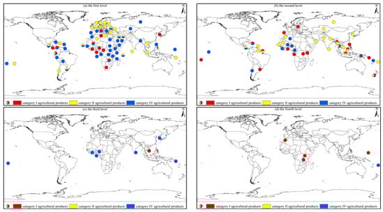In order to better present and analyze the research results and then formulate development strategies for western agricultural trade, this paper divides the eight categories of key trading countries into four levels based on their orders priority for trade development. The first level includes A2 and A1 countries; the second level includes A3 and A5 countries; the third level includes A4 and A6 countries; and the fourth level includes A7 and A8 countries. On the basis of Table 3, Table 4 and Table 5, the paper employs ArcGis to draw the results of the level division of key trading countries for various agricultural products on the map, as shown in Figure 7. There is only one potential trading country in category I agricultural products. The result is already obvious. Therefore, the analysis is not shown in Figure 7.