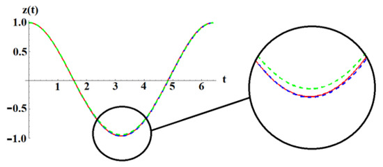 The Figure 2 shows the comparison between the approximate solution (40) of nonlinear Equations (22) and (20), the approximate solution (41), and numerical integration results obtained by means of a Runge–Kutta approach.