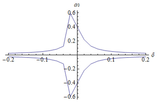 Figure 3 shows the variation of the amplitude a0 obtained from Equation (61) in respect to detuning parameter δ. The positive values of a0 increase up to δ ≈ −0.02, and then, the amplitude a0 decreases for δ > −0.02 and vice versa if a0 is negative. It is obvious that the graph of the amplitude a0 is symmetrical with respect to the horizontal axis Oδ.