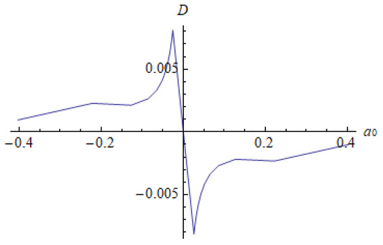The graph of D with respect to a0 for δ > 0 is plotted in Figure 5, and the graph of D with respect to a0 for δ < 0 is plotted in Figure 6. The graphs of the discriminant D are not monotonous on the entire domain δ [−0.2, 0.2] and a0 [−0.002, 0.002] for δ > 0. The same discussion appears for δ < 0. The discriminant D for δ < 0 increases on each domain (−0.59, −0.4), (−0.3, −0.08), (0.08, 0.3), and (0.4, 0.59).