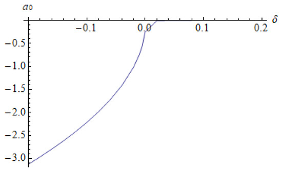 Finally, the graph of a0 for D = 0 is presented in Figure 7, and the nodes are unstable. It should be emphasized that from the quintic algebraic equation D = 0, where D is given in Equation (77), one can obtain at most five solutions. However, the amplitude a0 depends on the coefficients M, N, and P defined in Equation (62) and implicitly on the δ [−0.2, 0.2]. It follows that D = 0 led to the amplitude a0 in the domain [−3, 0].