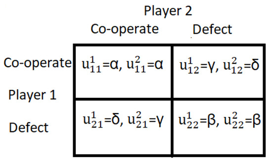 The prisoner’s dilemma game payoff matrix denoted in Figure 1 is used in this work for modeling social interactions among neighboring players. In the prisoner’s dilemma game, the payoffs satisfy the inequality conditions .