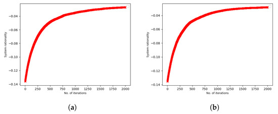 The system rationality, which is the average Jensen–Shannon divergence as defined by Equation (9), is different from the average rationality . The quantity denotes the average of the heterogeneous rationality values assigned to each agent. However, two populations with the same may have different system rationality values, as it is possible to have more than one topology with the same degree distribution, and the rationality parameter of each node in this work is a function of its degree.