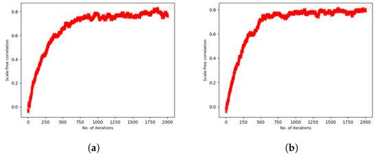 Scale-free correlation against the number of iterations of rewiring. The figures indicate that the scale-freeness of the topology increases over 2000 iterations of rewiring when preferential re-wiring based on node-rationality occurs. This happens whether the node rationality is (a) positively or (b) negatively correlated with the degree. Therefore, preferential rewiring based on the node rationality parameter results in increased scale-freeness.
