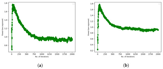 Power-law exponent against the number of iterations of rewiring. The figures indicate that the power-law exponent reaches 1, indicative of a core-periphery topology emerging, over 2000 iterations of preferential rewiring based on node rationality. This happens whether the node rationality is (a) positively or (b) negatively correlated with the degree.