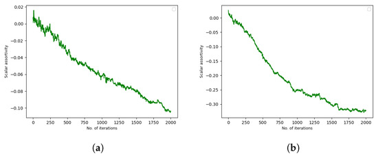 Node rationality-based scalar-assortativity against the number of iterations of node rationality-based preferential rewiring. The scalar disassortativity increases over 2000 iterations whether (a) node rationality is positively correlated with node degree or (b) node rationality is negatively correlated with node degree.