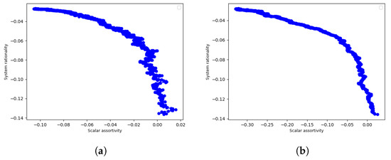 System rationality against node rationality-based scalar assortativity, derived from the intermediate networks obtained when the random topology is rewired to improve the system rationality over 2000 iterations. It can be seen that system rationality is positively correlated with scalar disassortativity whether (a) node rationality is positively correlated with node degree or (b) node rationality is negatively correlated with node degree.