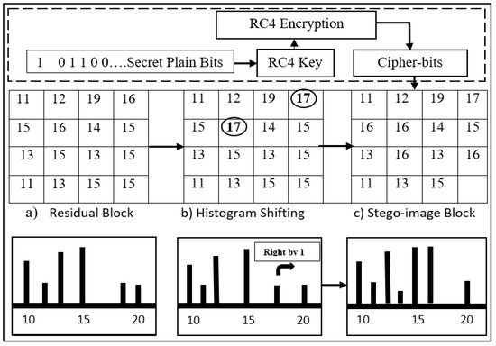 The format of the secret data can be either plain or raw, compressed, encrypted, or a combination of both, that can be hidden or concealed within the cover medium [10]. Various cryptographic operations in steganographic schemes have been proposed for the protection of secret data concealed in digital images before transmitting them over a network [11,12]. For example, modulus operations, AES, map-based scramble techniques, XOR, RC4, RSA, etc. These cryptographic methods are combined with digital image processing data hiding techniques [9,13,14,15,16,17,18,19,20]. However, among various methods of cryptography used, RC4 has many advantages, such as higher computational speed, resilience to cryptographic attacks, and providing stability to histogram values [13,14,15]. Steganography based on RDH scheme is generalized into three methods, namely the compression method, histogram shifting and expansion-based methods [21,22,23]. The proposed scheme uses histogram shifting for concealing secret data bits into the cover image.