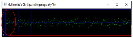 Figure 12 shows an image having 1 kb random data which is detectable by the chi-square attack. The data is embedded using a simple LSB technique. In Figure 12, the red curve is maximum at the beginning, and eventually, it drops to zero showing the presence of 1kb of hidden data. This shows that there is data embedded in the image, and this one kilo byte of data is packed around 0.5 pointing towards randomness.