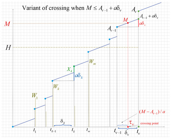 Now the first crossing of threshold M can occur at , and will most likely exceed M rather than attain to M. But because is continuous in interval , crossing of M can also take place in this interval where sharp. Yet the point t at which assumes M is obviously random. So it makes sense to define the crossing point by as