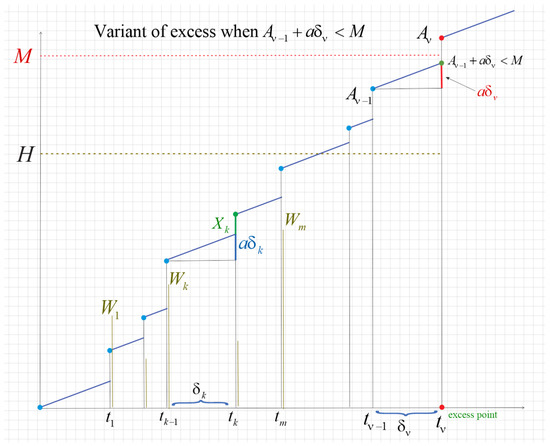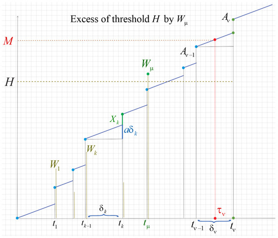 In 2021, Li et al. [5] proposed an interesting mixed system that can be applied to satellites or various spacecraft. The lifetime of the phased mission systems can be separated into several phases, in which their tasks, system configurations, and failure criteria are different. Shocks are due to radiation from outer space and they cause an additional wear and fatal damage to electronic devices in these systems. The authors modeled the system by a Markov regenerative process. More specifically, the self-wear linear process is (), additional wear is cumulative driven by iid (independent and identically distributed) Gaussian r.v.’s, external damages (extreme) are due to iid Gaussian r.v.’s. Both are independent. Shocks follow an ordinary Poisson process.