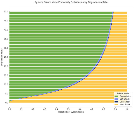 For a given set of model parameters, the four probabilities in Corollary 1 constitute a categorical probability distribution of the types of failures (i.e., failure modes) the system will take. Figure 5 shows these probability distributions for fixed parameter values but with the degradation rate a varying from 0 to 30. The probabilities have a clear relationship to the degradation rate. As a increases, the probability of degradation failure increases, which makes sense since a quicker constant degradation causes the damage to grow quickly toward the failure, leaving less time for failures caused by shocks.