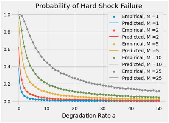 Suppose , . Figure 6, Figure 7, Figure 8 and Figure 9 show a comparison of predicted and empirical probabilities of each type of failure: degradation failure, soft shock failure, dual shock failure, and hard shock failure, respectively. The smooth curves correspond to the predictions for probability of failure modes from Corollary 1 for a range of values for the degradation rate a and the failure threshold M. More specifically, we choose , and compute the predicted probabilities for each pair of values using the latter code provided in Appendix A.