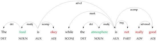 We employ the dependency parser in the Spacy toolkit to generate syntactic dependency trees for sentences. Taking “The food is okey while the atmosphere is not really good” as an example, its dependency tree structure is shown in Figure 1. As seen from the figure, green fonts represent aspect words, red fonts represent sentiment words, directed edges represent dependencies, and labels represent dependency types. In this paper, to fully exploit the syntactic information of syntactic structure, we use a graph convolutional neural network to encode a syntactic dependency tree to capture the syntactic dependencies of aspects and contexts.