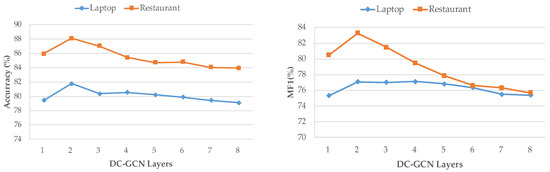 To verify the impact of the number of DC-GCN layers on model performance, we compare the results using layers one to eight on the Restaurant and Laptop datasets. The experimental results are shown in Figure 5. From the data in the figure, we know that when the number of layers is 2, the performance of the model is the best. However, when the number of layers is less than 2 or more than 2, the accuracy and the MF1 value of the model are relatively lower. On the one hand, the feature learning between nodes is not sufficient when the number of layers is low. On the other hand, with the increase in the number of layers, the problem of gradient disappearance or gradient explosion easily occurs due to the increase in transformation operations in the GCN, which makes the model performance degenerate.