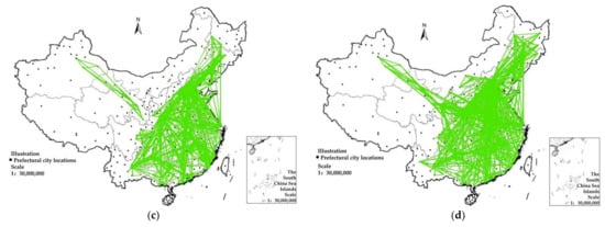 Evolution of urban HSR networks in China. (a) 2008, (b) 2011, (c) 2016, (d) 2020.
