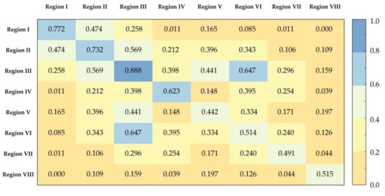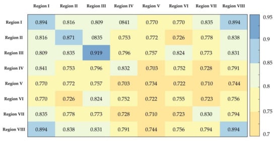 The report “Strategies and Policies for Coordinated Regional Development [36],” released by the Development Research Center of the State Council in June 2005, proposed development strategies for the eight comprehensive economic zones, namely the northeast (Liaoning, Jilin, and Heilongjiang), the northern coast (Beijing, Tianjin, Hebei, and Shandong), the eastern coast (Shanghai, Jiangsu, and Zhejiang), the southern coast (Fujian, Guangdong, and Hainan), the middle reaches of the Yellow River (Shaanxi, Shanxi, Henan, and Inner Mongolia), the middle reaches of the Yangtze River (Hubei, Hunan, Jiangxi, and Anhui), the southwest (Yunnan, Guizhou, Sichuan, Chongqing, and Guangxi), and the northwest (Gansu, Qinghai, Ningxia, Tibet, and Xinjiang). Therefore, we regard the eight comprehensive economic zones as subgroups of the overall network and then calculate the density between subgroups. We explore regional differences in the HSR network in 2020 (Figure 2).