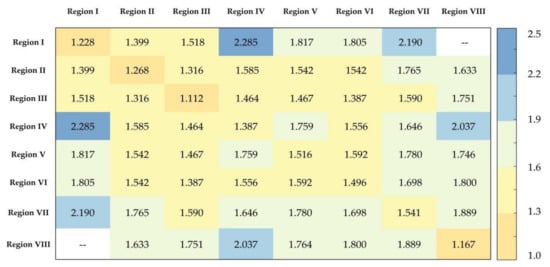 In terms of interregional network accessibility averages, the regional differences are not significant. The eastern coastal region, with an average path length of 1.451, has the most convenient connections with other regions. Next, the average accessibility values of the northwest, north coast, and northeast regions are slightly weaker than that of the east coast, with average path lengths of 1.505, 1.506, and 1.530, respectively. Again, the middle reaches of the Yangtze and Yellow Rivers are less accessible on average, with average path lengths of 1.610 and 1.655, respectively. Finally, the southern coastal and southwestern regions have the weakest average accessibility, with average path lengths of 1.715 and 1.762, respectively. Cities in the northwestern region with HSR networks are not directly connected to cities in the northeastern region by HSR; therefore, there is no accessibility value between the two regions.