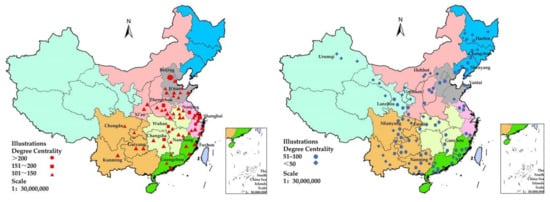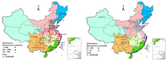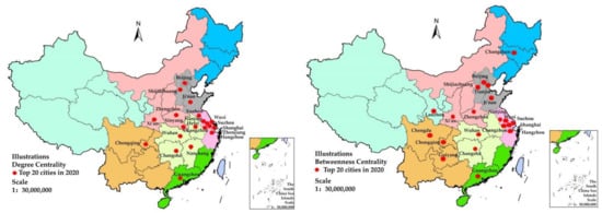 Furthermore, Figure 7 shows the geographical location of the Top 20 cities in terms of centrality in China.