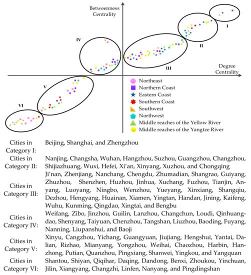 Finally, the cities with extremely low degree and betweenness centralities (i.e., and ), such as Chaoyang, Fuxin, and Mudanjiang, could not be represented on the quadrant map. Most of these cities are located in the northeast and northwest regions and are relatively backward in terms of economic development. Owing to the “lag” in the opening of HSR, the positive impact of the opening of HSR on small cities around big cities will be gradually reflected in future development.