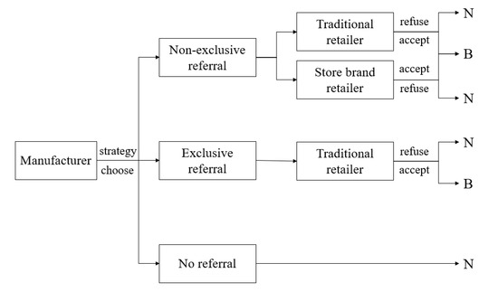 This section presents the model of a supply chain consisting of a manufacturer and two competing retailers. The manufacturer produces product X and sells it to consumers through retailers. Retailer 1 is a traditional retailer who sells only product X, while Retailer 2, as a store brand retailer, not only sells product X but also produces and sells its own-brand product Y. There are three options for the manufacturer’s referral strategy: no referral (denoted by N), exclusive referral to the traditional retailer (denoted by R) and nonexclusive referrals to both retailers (denoted by B). Similarly, the traditional retailer is also faced with three choices of N, R and B, while the store brand retailer has only two choices of N and B. The choice can be implemented only if the two parties reach a cooperation agreement. Figure 1 shows the decision-making process for a referral cooperation between the manufacturer and retailers. Product X and product Y are substitutes for each other. The product X sold by Retailer 1 is called L1, and the product X sold by Retailer 2 is called L2. There is channel competition between L1 and L2. The product Y sold by Retailer 2 is called L3; then, L3, L1 and L2 are brand competitors. To simplify the model, the competition between chains is represented uniformly by .