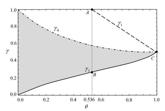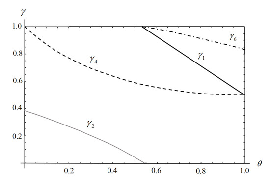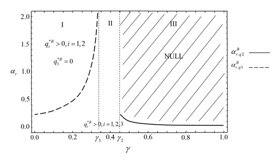 A similar method is used to analyse , denoted by . It is easy to find that the numerator of is negative. Let the numerator equal 0, and we can obtain the critical value . By analysing and , we can obtain the threshold of the consumer market loss rate, and the conclusions are as follows.