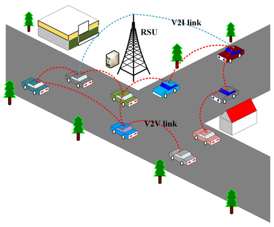 Figure 2 shows a hybrid VEC-based architecture for cooperative perception. In our research, urban areas are divided into several small regions, and there is one RSU located in the center of the region. The region size is determined by the communication capability of the RSU, and a wide region size implies that more AVs could participate in cooperative perception. Therefore, the number of participating AVs is a key parameter behind the region size. We focus on one of these regions, and the research results of the region can be applied to the others. The RSU is equipped with communication devices and connected to edge servers; it acts as a scheduler to provide services to AVs in the region. In a region, assuming that there are AVs that are participating in cooperative perception, we use to denote the AV set. AVs can connect to the RSU via V2I links and can connect to each other via V2V links. We assume that an AV or RSU can communicate with several AVs simultaneously, and there is no interference in these communication links.