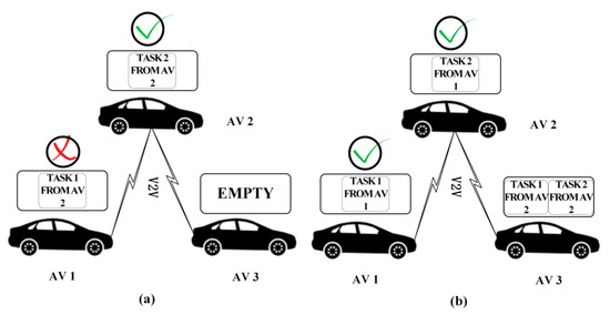 Example: impacts of NoN on the number of AVs whose tasks can be completed. (a) Vehicle with more NoN offloads first; (b) otherwise.