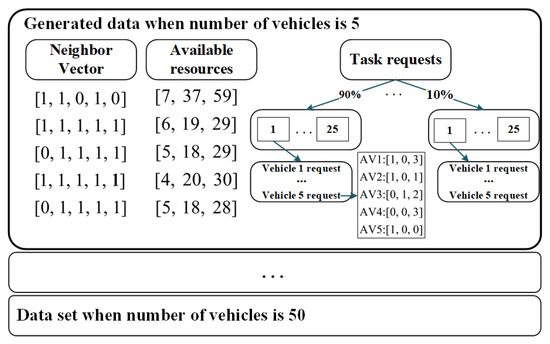 For a better understanding, the structure and content of the dataset are illustrated in Figure 5. For example, there are vehicle connectivity, available resources and task requests in nine RSDs when the cluster scale is 5. We can use the neighbor vector, available resources and 25 groups of task requests in different RSDs to synthesize 255 groups of data, which can denote task requests under different vehicle loads in a time slot. The data of other cluster scales can be synthesized in the same way.