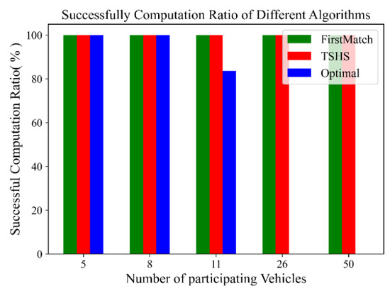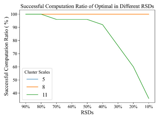 Before comparing the time performance of different scheduling algorithms, we first analyze the ratio of successful computations of the three algorithms in the simulation. A task scheduling decision is regarded as successful when it can be determined in an hour, and a long determination time is not sufficient because of the real-time and mobility requirements in the autonomous driving domain. Figure 6 illustrates the successful computation ratio of all simulations (a total of 255 in a scale) for three different algorithms under various cluster scales. The successful computation ratio of TSHS and FM is always 100% with the increasing cluster scale, but it declines with the increasing cluster scale for the optimal algorithm. When the cluster scale is 11, only 80% of the simulations can be completed within a fixed time. To detail the impact of RSD on the successful computation ratio, Figure 7 illustrates the successful computation ratio of the optimal algorithm along with the decrease in RSD under different cluster scales. The ratio of successful computation decreases rapidly with the increase in RSD when the cluster scale is large. Thus, the optimal offloading result cannot be acquired within a short period when the cluster scale is large, especially for vehicles in clusters with heavy loads. On the other hand, the TSHS can still acquire a good scheduling scheme within a short period.