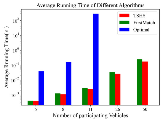 Figure 8 illustrates the mean time consumption for acquiring results with different algorithms when the cluster scale changes, in which blue denotes optimal, red denotes the TSHS and green denotes FM. The mean time of each cluster scale is the mean value of the times of all RSDs, which denotes the average performance of the algorithm under different cluster loads. The time of each RSD is calculated by averaging the values of its 25 simulations to reduce the influence of randomness on the analysis. The optimal time increases rapidly with increasing cluster scale. Because of the long running time of the optimal algorithm, we conduct simulations using the optimal algorithm when the cluster scale is less than 12. The optimal algorithm is aborted because of memory overflow or cannot finish because of a very long execution time. Therefore, the blue bars are missing when there is a large number of participating vehicles. On the other hand, the running time of the TSHS is much less than optimal and does not increase significantly with increasing cluster scale. The TSHS is also better than FM in the simulation. Therefore, the proposed TSHS has good time performance and can be used when the cluster scale is large.